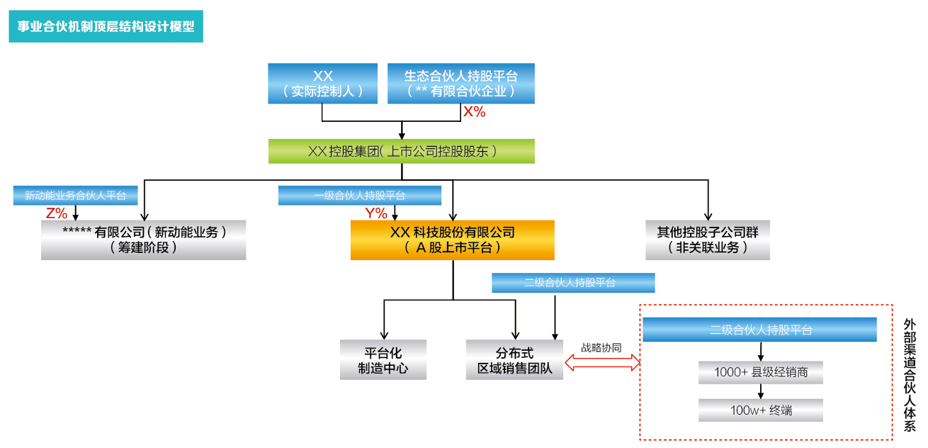 事业合伙机制不是股权激励,不是传统的资源整合,不是简单的利益共享。事业合伙机制是建立在去中心化、利他主义、长板效应的思维下,将资本、技术、智力等等价值创造供给方合作共赢、共识共担共创共享的一种分工协同机制。各价值创造相关方,在事业合伙人的交易结构中,分别获得各自希望得到的价值,并依此作为共同奋斗的原动力。