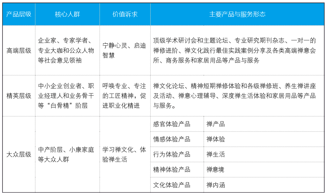 其产品主要是针对中产阶层、小康家庭等大众人群,核心价值是学习禅文化、体验禅生活。这个群体的生活比较稳定,渴望去不断充实自我的精神世界。这种产品主要包含以下五种产品和服务形式——