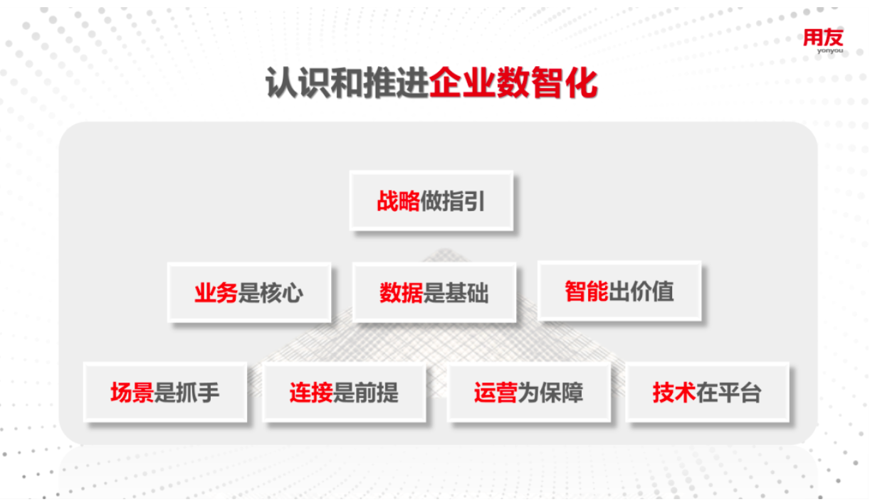 最后一点,技术在平台。数智化涉及到技术那么多,而且这些技术还在快速变化,每个企业不可能都具备这样的能力,即便今天具备了,不代表明天还具备。这一点大家不要担心,跟大家用手机一样,手机的技术极其复杂,但是我们使用是很简单的,因为技术都在技术平台,包括用友这样的厂商。我们在平台里面已经把这些技术给提供了,技术都在平台里面,大家应用就可以了。