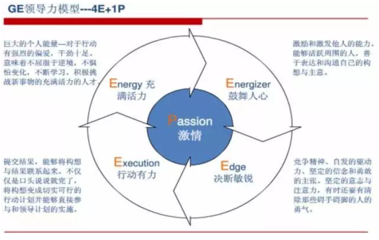 (三)行为。我们经常说领导要有领导的样儿,其实说的就是行为。做为工人,可以在背后发发牢骚,可以衣冠不整,一旦成为领导干部,就要做榜样,做表率。全球著名的GE的4E1P领导力模型如下: