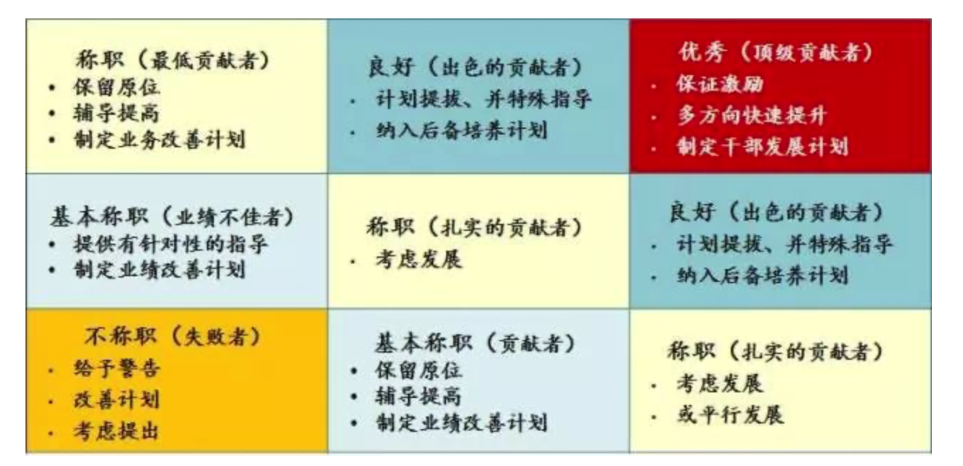 这是现在大家普遍接受的“绩效—行为”二维评价模型,也称九宫格模型。