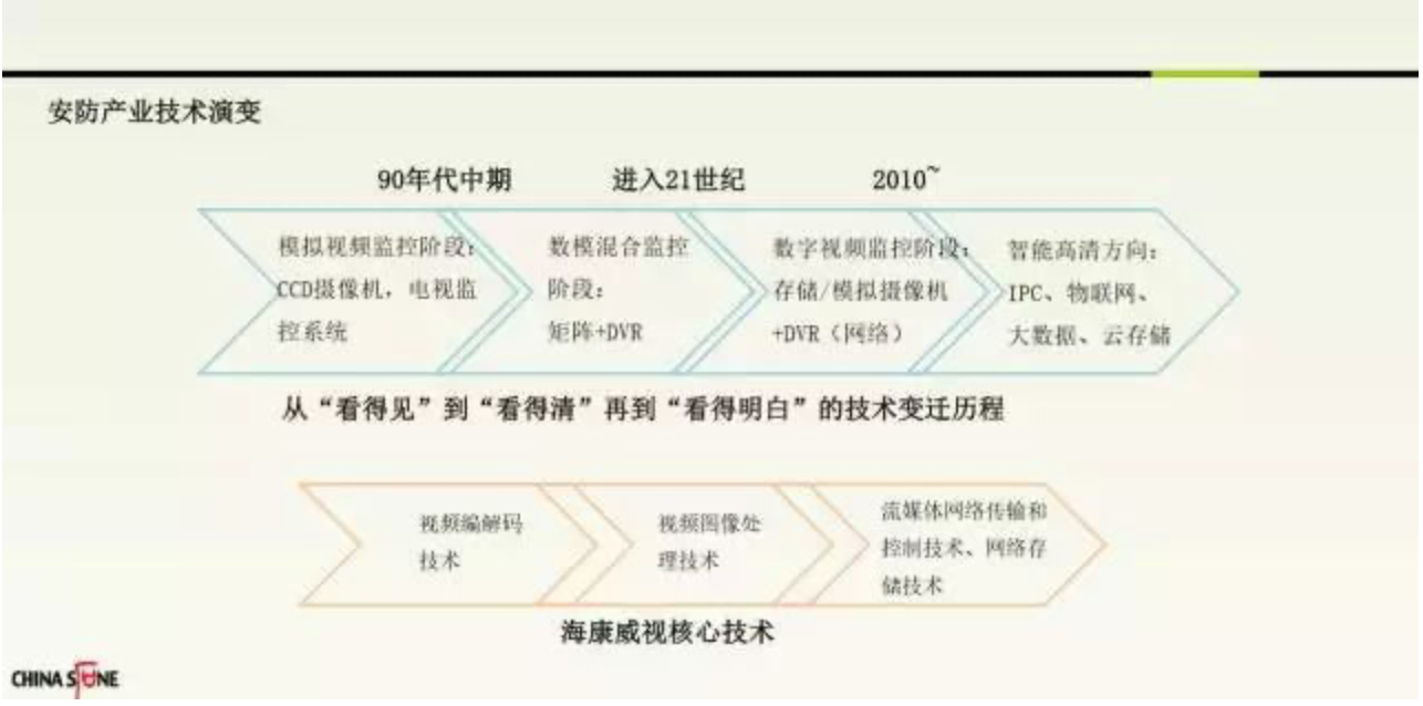 海康威视是在九十年代中期开始模拟视频监控阶段,做CDD摄像机、电视监控系统、数模混合监控,到现在做数字控制监控、智能高清,完成从看得见,到看得清,再到看得明白的进化。现在交通流量很大,只靠人工安防根本是完成不了的,所以要有新的技术,当前最新的技术涉及到流媒体网络传输、控制技术和网络存储技术等等。
