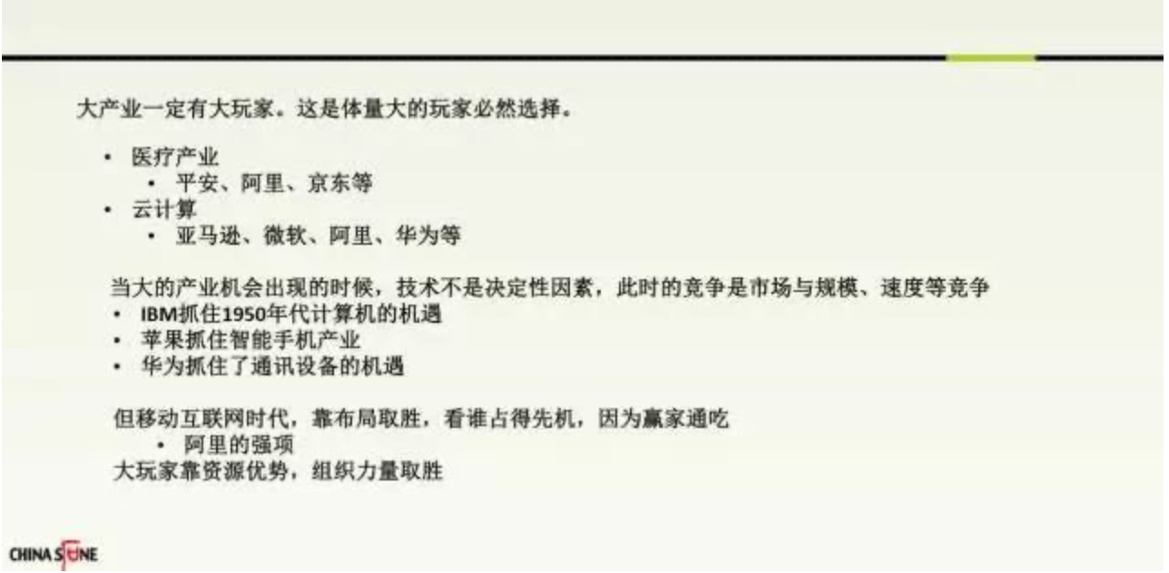 大势市场已经形成的产业,需要迅速把握机会,包括新能源产业、云计算产业、大健康产业、高分子材料、物流行业,现在的趋势首先需要大资金的进入,比如大健康产业八万亿的市场,全是阿里、平安等在布局,没有大资金是做不了的。越是大行业,资金越密集,所以说:大产业一定有大玩家,这是体量大的玩家的必然选择。大健康、云计算这些大的产业出现之后,技术绝对不是必然因素,此时的竞争,是市场、规模与速度的竞争。IBM抓住1950年代计算机的机遇,苹果抓住智能手机产业 ,华为抓住了通讯设备的机遇,在移动互联网时代,靠布局取胜。占得先机,成为赢家就能通吃。