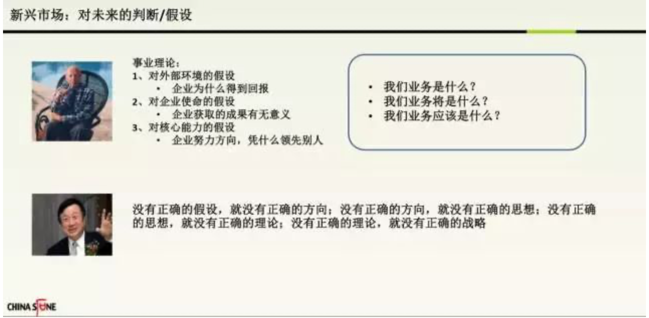 关于新兴市场,任正非曾说:“没有正确的假设,就没有正确的方向;没有正确的方向,就没有正确的思想;没有正确的思想,就没有正确的理论;没有正确的理论,就没有正确的战略”。这就要判断,那么凭什么来判断市场?需要对未来进行假设,包括对外部环境的假设、随企业使命的假设和对核心能力的假设。