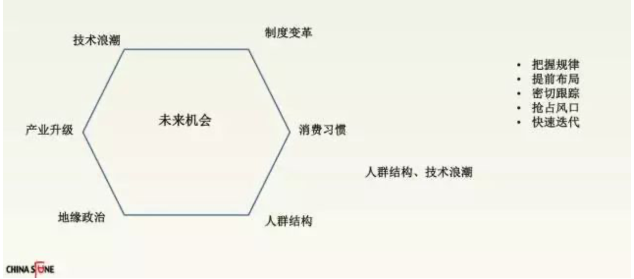 下面说到未来的机会到底在那个地方?就是要把握规律、提前布局、密切跟踪、抢占风口、快速迭代。这个话大家都会说。我们要依靠的是对产业升级、地缘政治、人群结构、消费习惯、制度变革、人群结构、技术浪潮七个维度的把握。