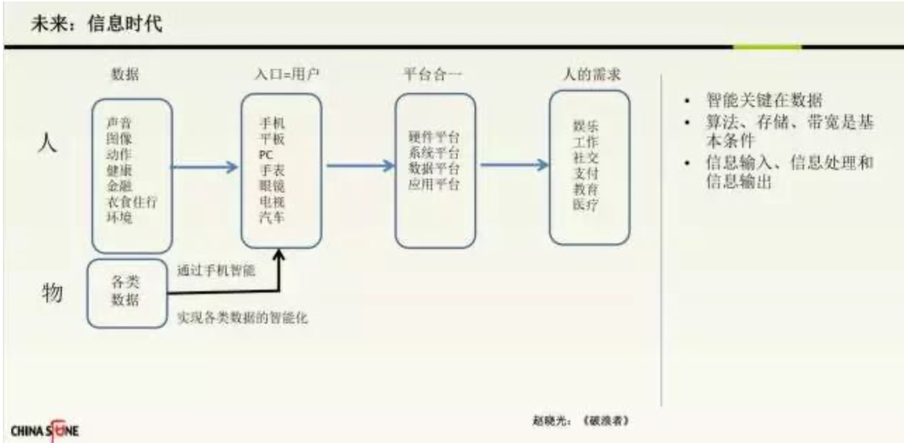 以入口为媒介,声音、图像、健康、衣食住行等,都是人的数据。入口就是用户,移动互联网时代,手机成为了最重要的入口。除了手机,还有汽车终端。重庆的小康汽车,就是要把车变成终端,在车上创造生产力。通过硬件软件等入口,平台实现智能化。智能的关键在数据,算法、存储、带宽是基本条件,以保证信息输入、信息处理和信息输出。信息输入、输出、处理,这是一个巨大的产业。未来是场景时代,应用为王,几个大玩家都要抢入口。应用端一定是基于场景和个性化,大企业不可能一统天下。