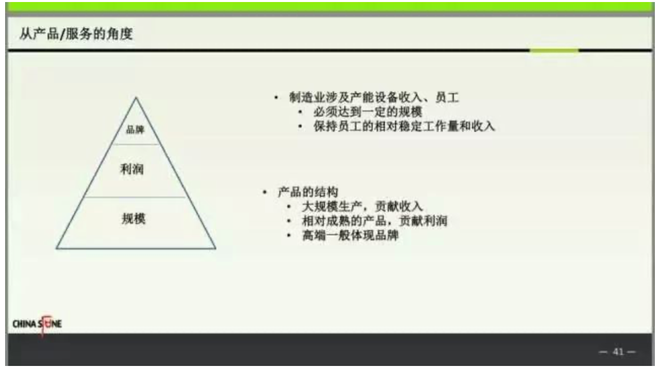 从产品的角度讲,制造业必须保证一定的规模,保持员工相对稳定的工作量和收入。从产品结构来讲,大规模生产的产品,贡献收入;相对成熟的产品,贡献利润;高端产品一般体现品牌。