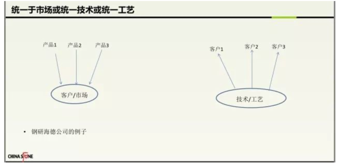 多元化必须要找准三个点:一个是市场、一个是技术、一个是工艺。这三个点具有一定的相关性,如果盲目多元化,成功率就比较低。这三点,有的统一市场,有的统一产品,有的统一工艺;统一市场难度最小,统一技术其次,统一工艺难度最大。要么统一于客户要么统一于技术,实在不行就统一于工艺。
