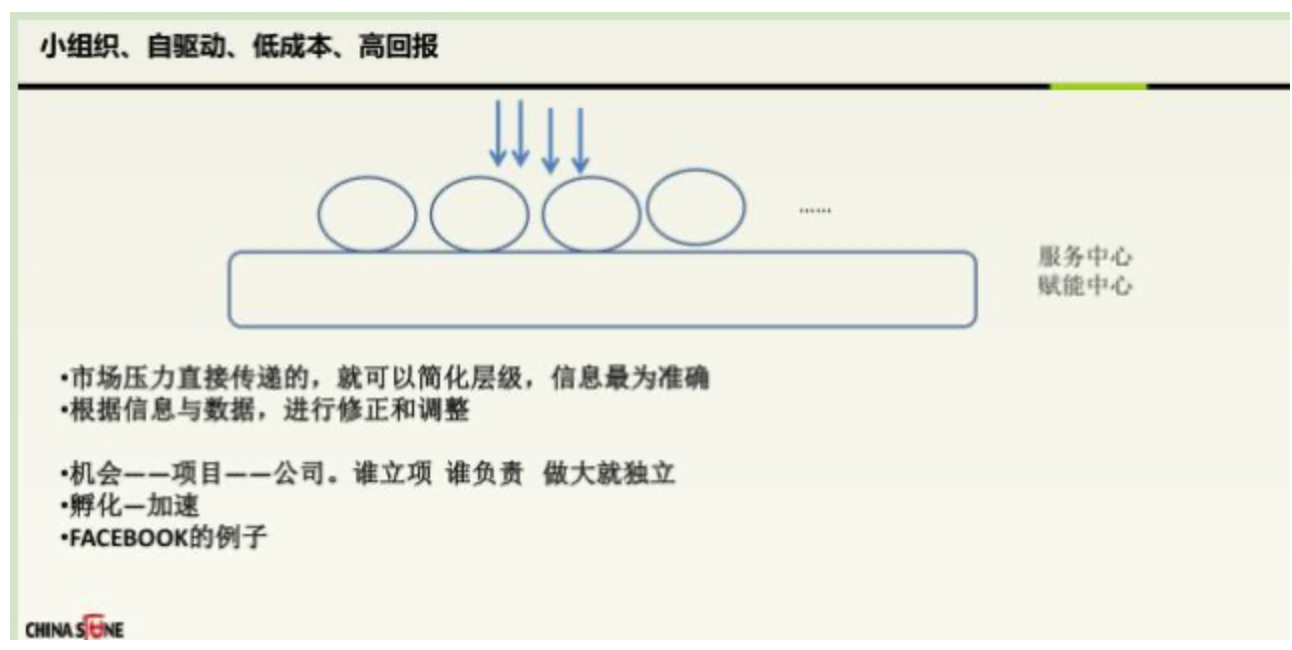 战略与组织的关系,实际上是战略决定组织,组织对战略具有反作用,组织决定一个企业的未来。小组织、自驱动、低成本、高回报,是组织发展的趋向。腾讯的做法就是,谁的项目谁负责,做大了就独立,平台就变成赋能中心、服务中心。
