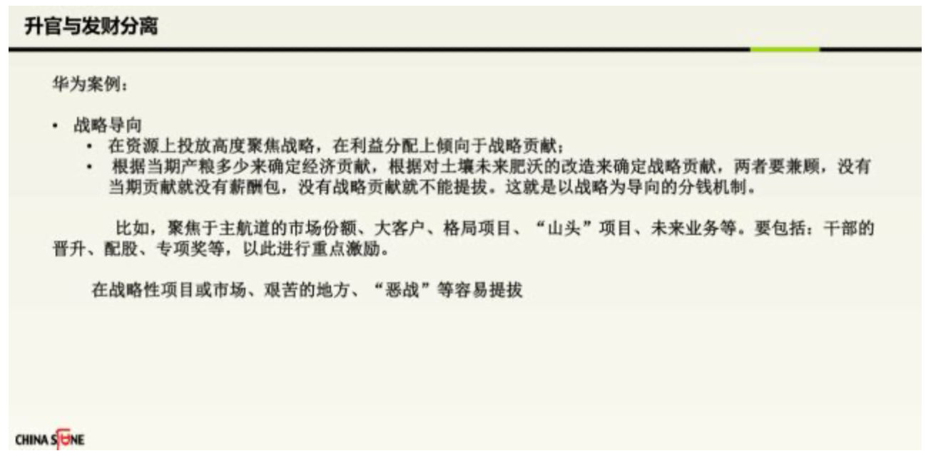 人才管理的关键在于机制,机制是什么?简练总结,就是凭什么获取报酬、凭什么分配资源。华为人才管理做得好的地方就是,“升官”与“发财”分离(升官可以理解为晋升、中长期利益;发财以短期利益为主,达标就拿钱),考核与评价分离(对基层员工以考核为主;对于中高层,要以价值观来评价),人与事分离(对于人与事的评价,有两套体系)。