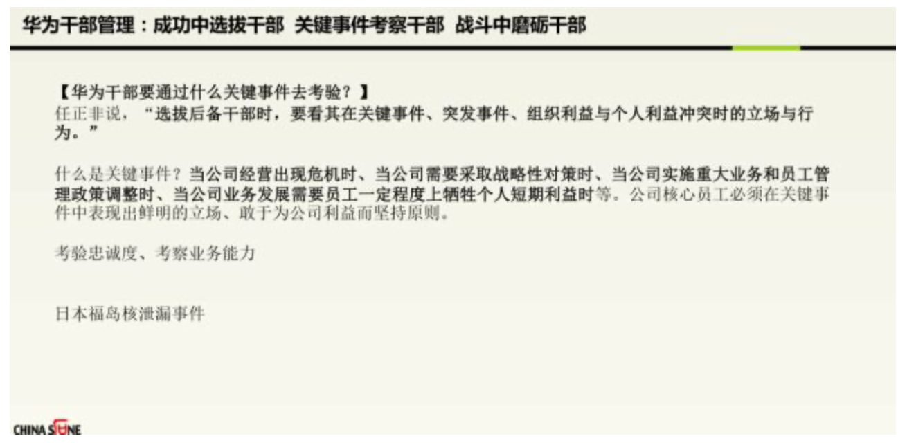 华为在高压场景下观察员工的判断。高压力下,关键时刻一个人的表态,才能看出来一个人的才能。像一般那种名校毕业几步就上来的干部,到了企业危机的时候,基本上没有什么用。华为的干部选拔借鉴了美军的方式。美军提拔干部,基本不靠考试,看的是各种场景压力下去考验人。因为他们认为看人不能看他平时怎样聪明,很关键是看在压力特别大的时候怎么决断怎么行动。所以美军就靠压力去淘汰人,不是靠考试。