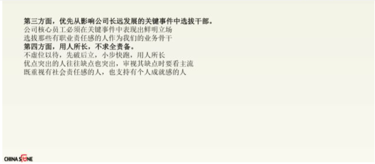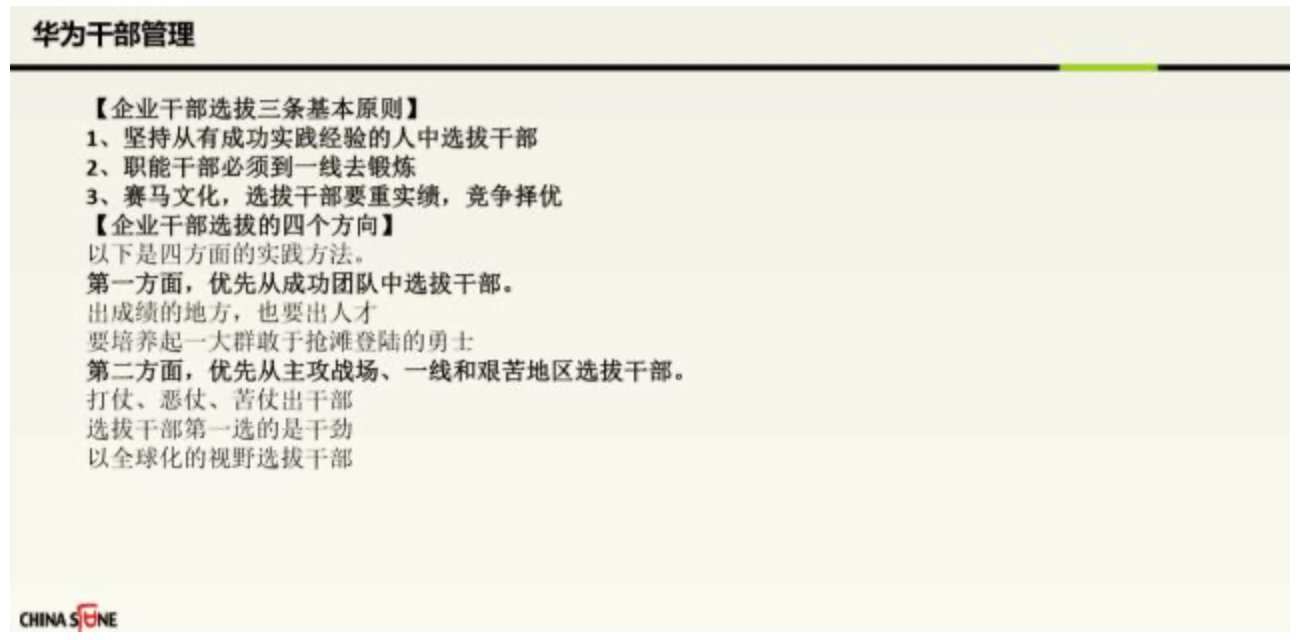 华为的干部管理很有特色,坚持在成功中选拔干部,关键事件考察干部,战斗中磨砺干部。对于干部考察,有四条:第一,绩效是必要条件和分水岭,有三条绩效标准:一是最终对客户产生贡献才是真正的绩效,二是关键行为过程中要以结果为导向,三是素质能力不等于绩效。第二,核心价值观是基础,华为的核心价值观主要是:以客户为中心,以奋斗者为本,长期坚持艰苦奋斗。第三,能力是关键成功要素,一是发展客户的能力,而是发展组织的能力,三是发展个人的能力。第四,品德是底线。