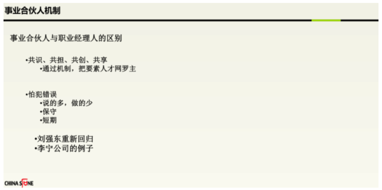 事业合伙人机制,可以很好地网罗人才,事业合伙人收得多、做得少。通过事业合伙人机制,可以把要素人才网罗起来。