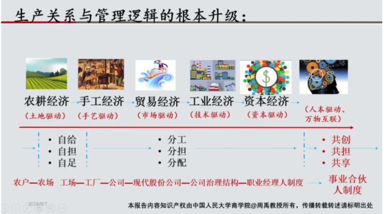 而在人本创新、全面联接的时代,我们认为生产关系必然会从“分工-分担-分配”向着“共创-共担-共享”去升级了,让人化被动为主动,大家共创增量,共担风险,进而共享增值。小农户“自给-自担-自足”,分工时代一直到今天,经济组织经历了从“作坊——工场——工厂——公司——股份公司——现代股份公司(两权分离)——公司治理结构——职业经理人制度”这个基本脉络的制度与组织演进。那往下走,在“共创-共担-共享”的趋势下,需要新的制度安排,我把基于这种原则逻辑的制度安排就称之为“事业合伙人制度”。