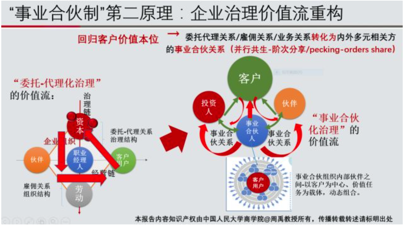 事业合伙制在治理结构上的关键原理,就是要把现代公司治理的“价值流”拉回到“客户本位”的根本上来,把委托-代理关系、雇佣关系进化为内外利益相关方的合伙治理关系。