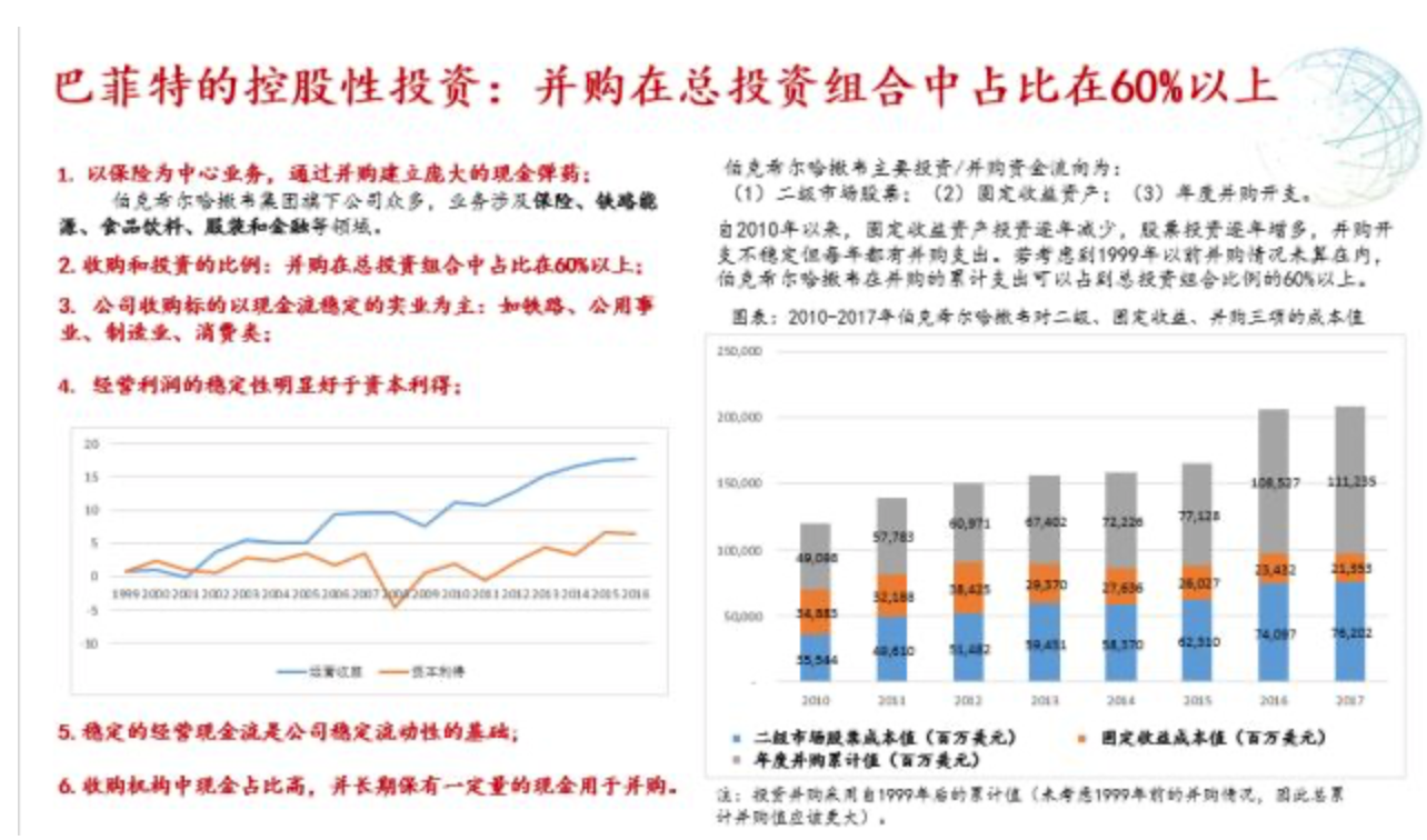 另外一家解法也比较另类,就是巴非特的伯克希尔-哈撒韦公司的做法,主要是保险业务的产融结合,我称之为“动作危险,请勿模仿”。很多人没有看明白,巴菲特最近60%是控制型投资,40%是股票和债券。他完成了一个组合,用保险的零成本资金去投资股票,股票投资收益又转化为实业经营的资本金,实业经营的利润则成为保险业务扩张的流动性后盾。动作其实是惊险的,很难模仿。因为产融的每个环节上都不能掉链子,一旦掉链子就会发生重要的问题。巴非特处理得比较好,保险业务严格控制了它的成本风险,他已经是全球比较大规模的前列保险公司,但是他的扩张方法依然是谨慎的,对风险定价是清晰的。股价必须长期保持正收益,难度也很大。实业投资必须要保持正现金流贡献,以巩固保险业务的流动性。所以他的投资组合,大部分都是一些现金流比较稳定的企业,例如食品,已经被证明成功的银行、制造业等。
