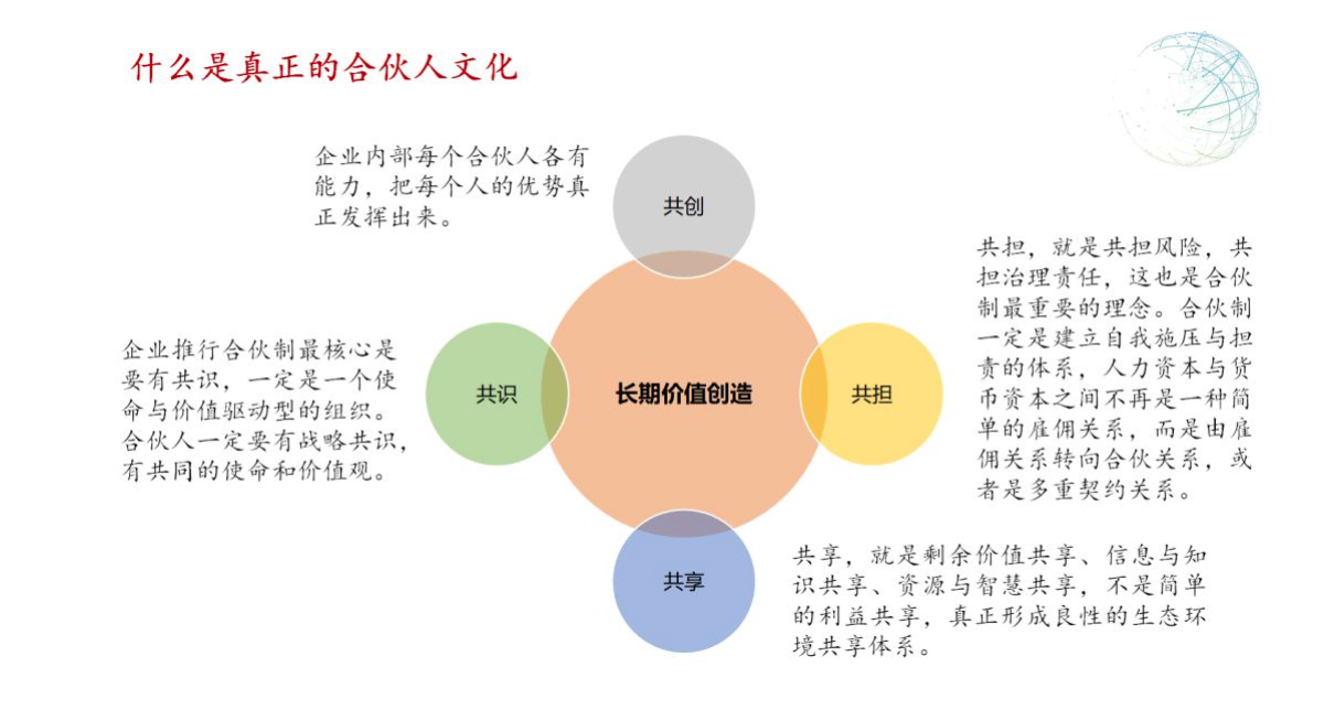 在总结基石资本的投资原则之前,先把我们基石资本的重要东西跟大家交流一下。基石资本的合伙人队伍高度稳定,离职的合伙人非常少,我们的同事认识都有20年了。对于基石资本来讲,我们怎么理解合伙人文化的?欧剑锋教授曾经做过一个小结,包含这8个字:共识、共担、共创、共享。我将之表述为下图: