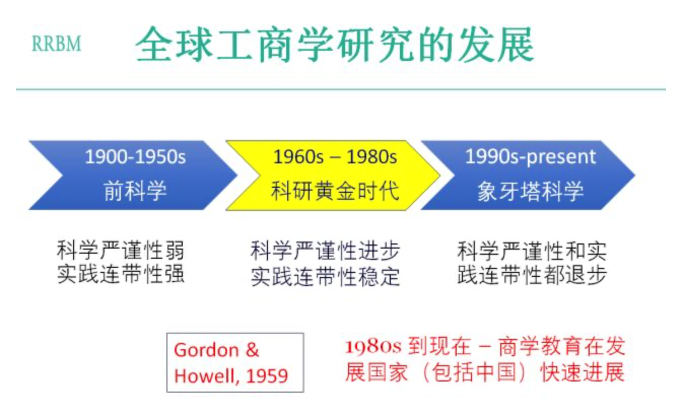 西方大部分谈的是美国的趋势,欧洲也有一点这样的趋势。从1980年代开始,商学教育在发展中国家包括在中国快速发展,中国的商学院从80年代开始,到今天我们有两三百所商学院,中国学者努力地学习西方的研究,参加到象牙塔的研究中。