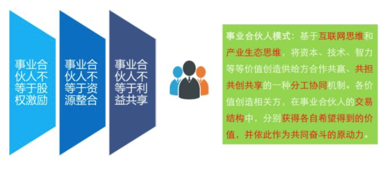 通过上述的分析和解读,我们回到刚才给事业合伙人模式的定义:基于互联网思维和产业生态思维,将资本、技术、智力等等价值创造供给方合作共赢、共担共创共享的一种分工协同机制。各价值创造相关方,在事业合伙人的交易结构中,分别获得各自希望得到的价值,并依此作为共同奋斗的原动力。