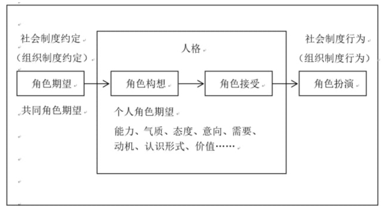 我们将上图中的“社会制度约定”和“社会制度行为”置换成“组织制度约定”和“组织制度行为”,可以用这一模型说明员工的角色实现。当企业进行角色管理时,先形成组织的共同期望;将其赋予员工,成为某种角色期望。而员工在自身的人格特征的“黑盒子”中,对该角色期望进行解读,进而完成自己的角色构想(Role Conception),即自我期望。例如,一个项目小组中的大多数人都希望张三能够明确项目方向,管控项目进度,带领大家攻关克难,这种共同期望赋予了张三“项目管理者”的角色。由于张三本身思想开放,善于沟通,喜欢头脑风暴而不喜欢专断,他会将“项目管理者”解读为一个“集思广益、善于聆听的项目管理者”,认为应该在项目中多鼓励、引导团队成员们提出合理建议。