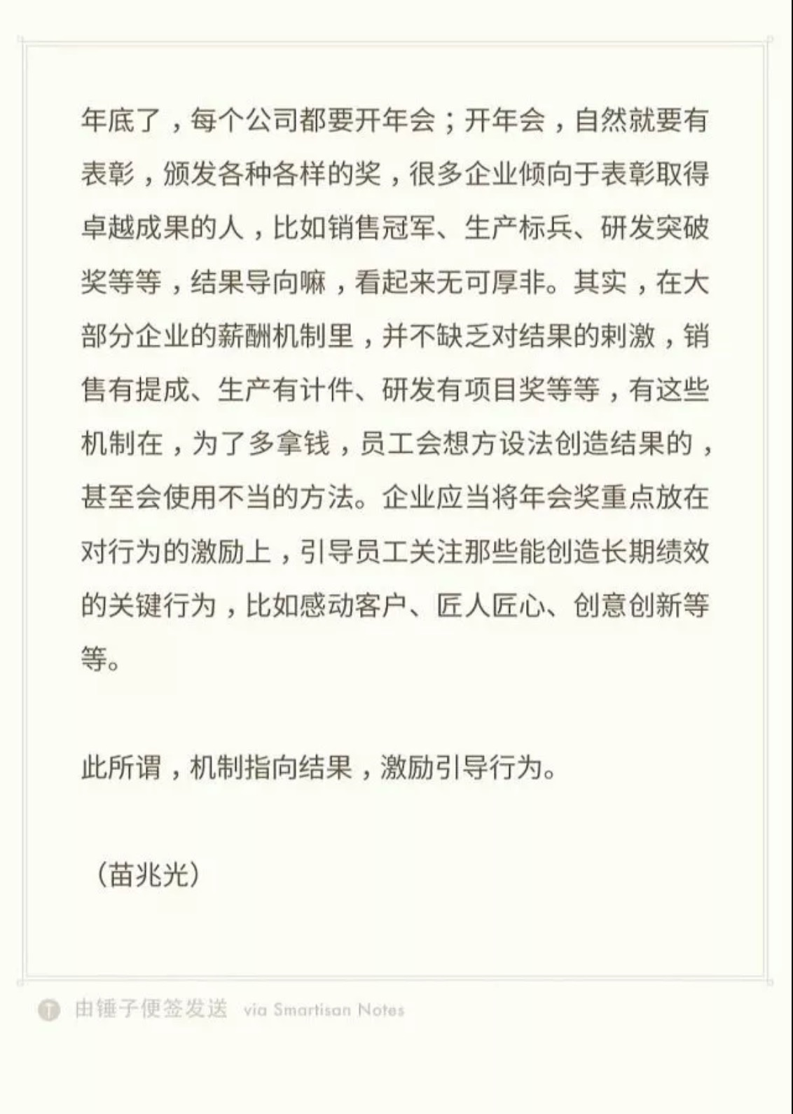 如果老板只谈结果,大家就会只从利益的角度去看事情。其实,不谈过程就很难优化,因为结果是过程做出来的,你不关注过程,只关注结果,你的过程永远是粗放的,就是所谓的粗放管理。