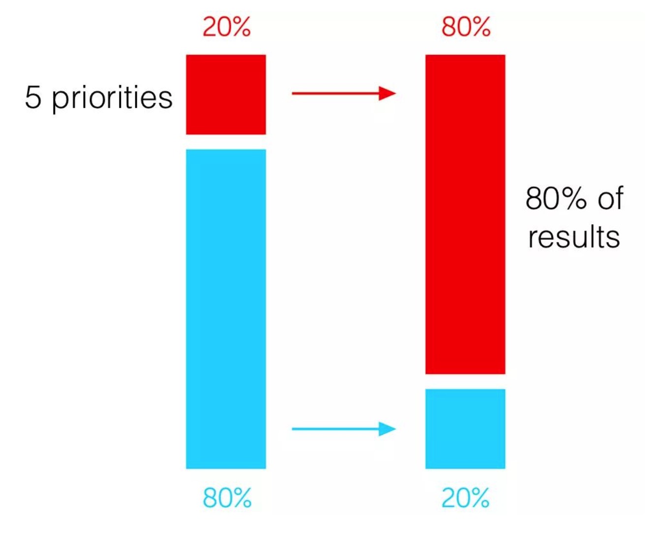 所以,如果你把25个优先事项的清单缩小到5个优先事项,你就可以再次运用80/20规则,把注意力集中在一个优先事项上,这个优先事项给了你这5个优先事项80%的结果。