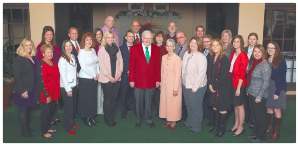 巴菲特已经消除了他公司几乎所有的官僚作风。伯克希尔·哈撒韦的投资组合公司有近40万名员工,但其实际的总部只有20多名员工。这是世界上最大的公司之一2014年圣诞派对的照片: