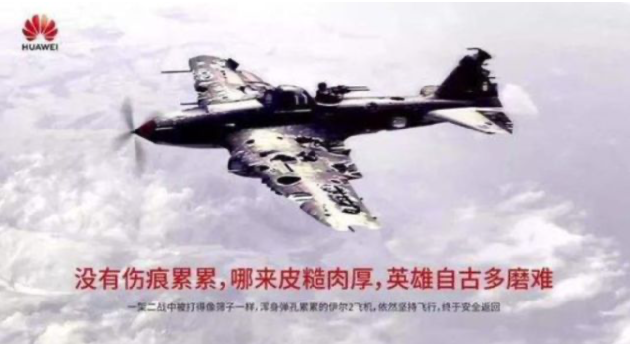 任正非说,华为就像在二战时期弹孔累累的伊尔2飞机,虽然被打得千疮百孔,但还要反抗,还要坚持朝着既定方向飞行。这架飞机代表了任正非的想法和感受:没有伤痕累累,哪来皮糙肉厚?英雄自古多磨难。
