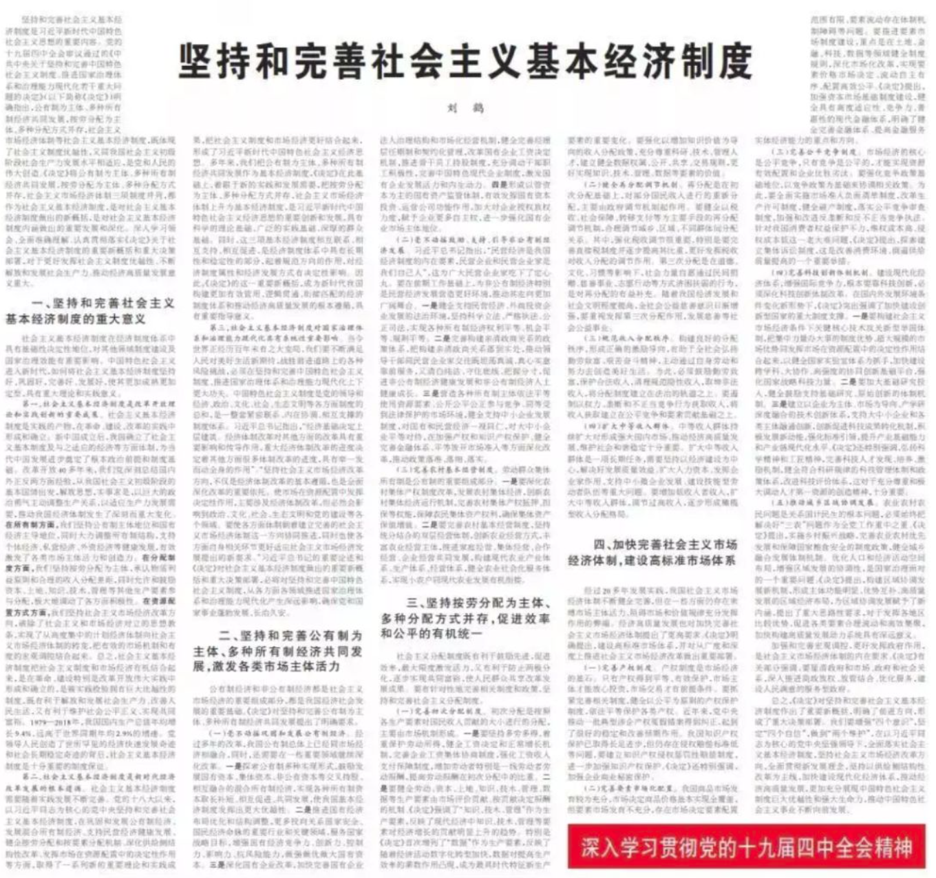 总之,《决定》对坚持和完善社会主义基本经济制度作出了重要新概括,明确了前进方向,形成了重大决策部署。我们要增强“四个意识”,坚定“四个自信”,做到“两个维护”,在以习近平同志为核心的党中央坚强领导下,全面落实社会主义基本经济制度,坚持社会主义市场经济改革方向,全面贯彻新发展理念,坚持以供给侧结构性改革为主线,加快建设现代化经济体系,推动经济高质量发展,更加充分展现中国特色社会主义制度巨大优越性和强大生命力,推动中国特色社会主义事业不断向前发展。