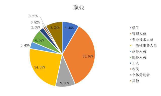 在所有被调查对象中,管理人员占比最大,为35.02%,其次是一般性事务人员(24.59%),农民与个体劳动者占比最少,分别为0.82%和0.77%。