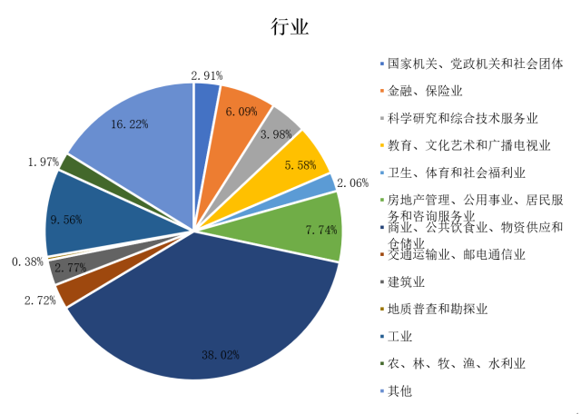 本次调查中,来自商业、公共饮食业、物资供应和仓储业的被调查对象最多,占总人数的38.02%;来自地质普查和勘探业的被调查对象最少,仅占总人数的0.38%。
