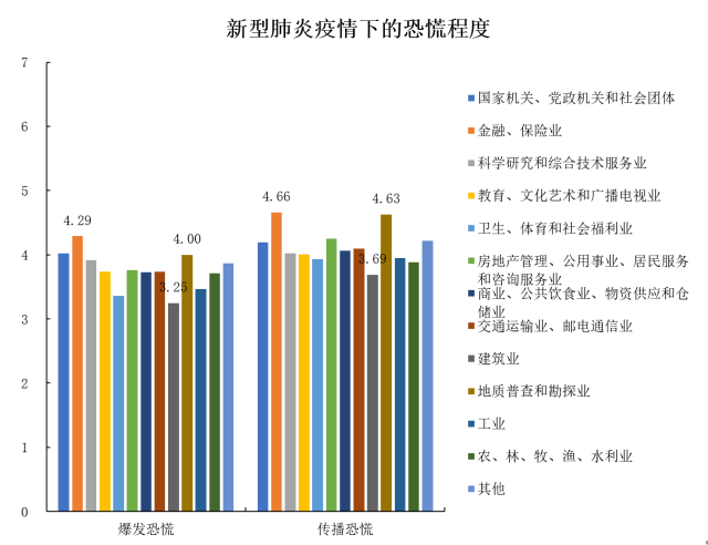 如图13所示,金融、保险业的从业者对于新型肺炎疫情的爆发和持续传播最为恐慌,其恐慌水平分别是4.29和4.66;其次是地质普查和勘探业的从业人员,其有关新型肺炎疫情的爆发和当前持续传播的恐慌水平分别是4.00和4.63;相较其他行业,建筑业的从业者对于新型肺炎疫情的爆发和当前持续传播的恐慌水平最低,分别为3.25和3.69。