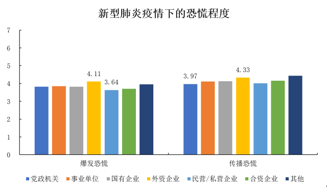 此外,所有年龄段、所有职业类型、所有学历的被调查对象对于当前新型肺炎持续传播的恐慌程度均高于他们在武汉封城、新型肺炎爆发时期的恐慌程度。