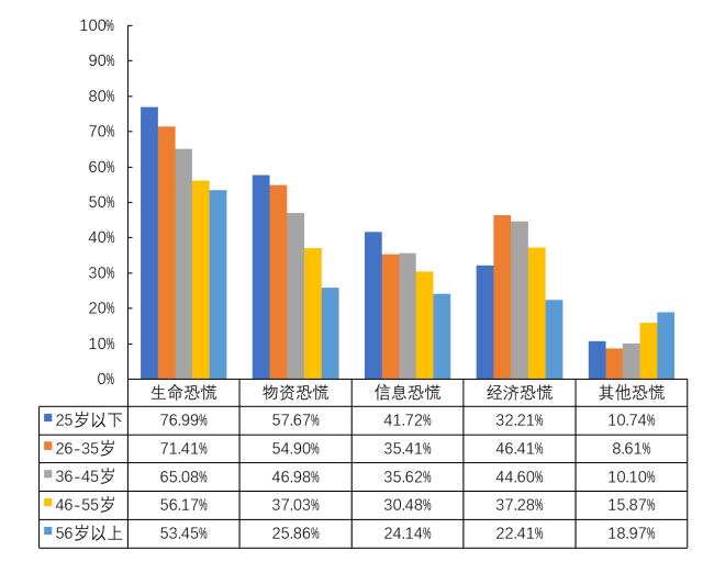 图19 不同年龄被调查对象恐慌原因的差异分布