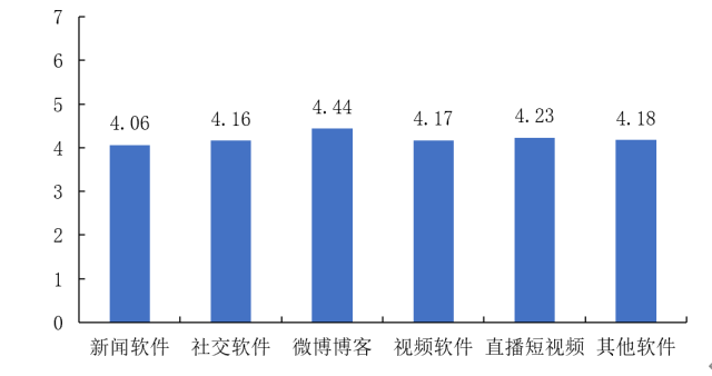 具体到不同的网络渠道发现:微博仍然反映出了最高的恐慌水平(4.39),其他几类网络渠道的恐慌程度分别为:直播短视频(4.25)、视频软件(4.16)、社交软件(4.15)、其他软件(4.15)、新闻软件(4.05)。(图29)