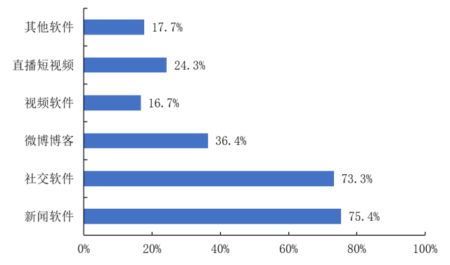 具体到网络渠发现:被调查者通过新闻软件(75.4%)及社交软件(73.3)作为信息渠道以获得新冠肺炎的传播和诊断情况的信息,明显高于其他渠道——微博博客(36.4%)、直播短视频(24.3%)、其他软件(17.7%)、视频软件(16.7%)。(图27)