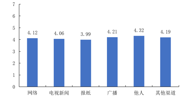 同样地,我们分析了不同的传播和诊断信息渠道下,被调查者所感受到的恐慌程度。结果显示:报纸同样是恐慌程度最低的信息渠道(3.99),其余信息渠道的恐慌程度分别为:他人(4.32)、广播(4.21)、其他渠道(4.19)、网络(4.12)、电视新闻(4.06)。(图28)