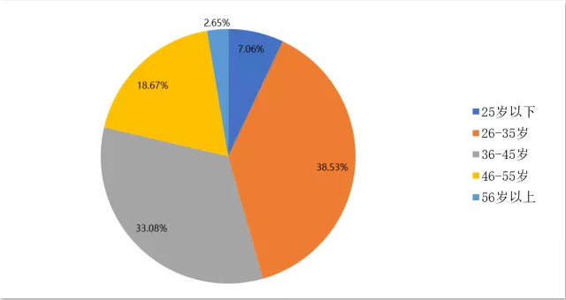 所有被调查对象的平均年龄约为37岁,其中年龄最小者为18岁,年龄最大者为79岁。而在所有被调查对象中,26-35岁的从业人员占比最大,为38.53%,其次是36-45岁的从业者(33.08%),56岁以上的从业者占比最小,为2.65%。