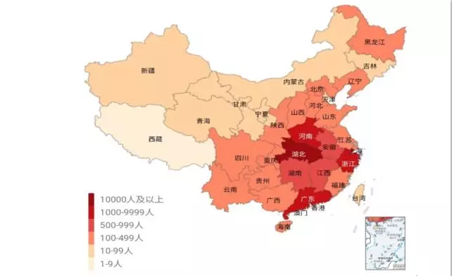 注:疫情地区划分标准根据各地截至2020年2月10日24时新型肺炎确诊人数进行划分,分为6个地区,分别是确诊人数10000人及以上地区,包括湖北;确诊人数1000-9999人地区,包括广东、浙江和河南;确诊人数500-999人地区,包括安徽、湖南和江西;确诊人数100-499人地区,包括北京、重庆、福建、广西、贵州、海南、河北、黑龙江、江苏、辽宁、山东、上海、山西、陕西、四川和云南;确诊人数10-99人地区,包括天津、甘肃、宁夏、吉林、内蒙古、新疆、青海、香港、澳门和台湾;确诊人数1-9人地区,包括西藏。(来源:腾讯新闻:疫情地图)(青海、澳门和台湾的样本数据暂缺)