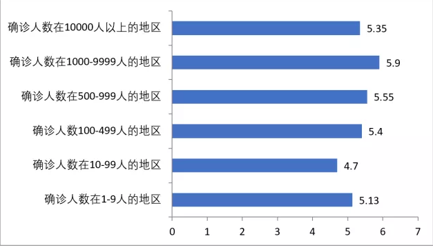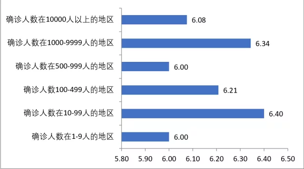 在接受调查的从业人员中,对于工资收入的关注程度全国平均水平是5.60分,确诊人数在1000-9999人的地区的从业人员对于工资收入的关注程度高于全国平均水平,为5.90分,其他地区均低于全国平均水平。