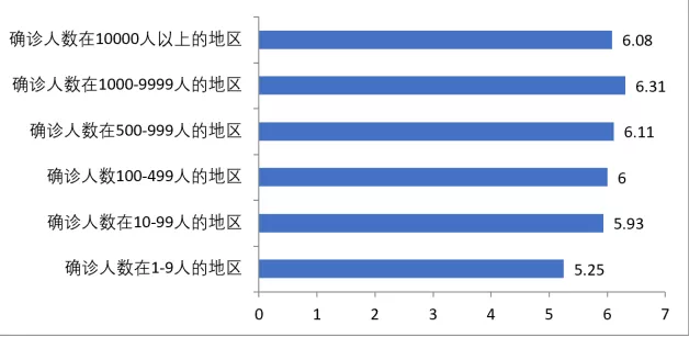 在接受调查的从业人员中,对于工作时间的关注程度全国平均水平是5.66分,除确诊人数在10-99人的地区对于工作时间的关注程度明显低于全国平均水平,为4.95分,其他地区均接近全国平均水平或略高于全国平均水平。