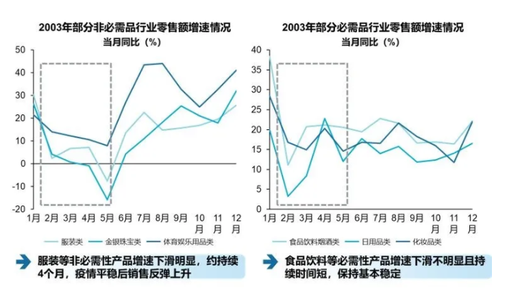 我们认为,除了增长率之外更应该看到规模的差异。2003年全年全国规模以上企业社会商品零售总额(消费品类)不足7000亿,二季度不足1500亿,总量约为2019年一季度或二季度的十分之一。即使产生同等影响,其总量仍不容小觑。