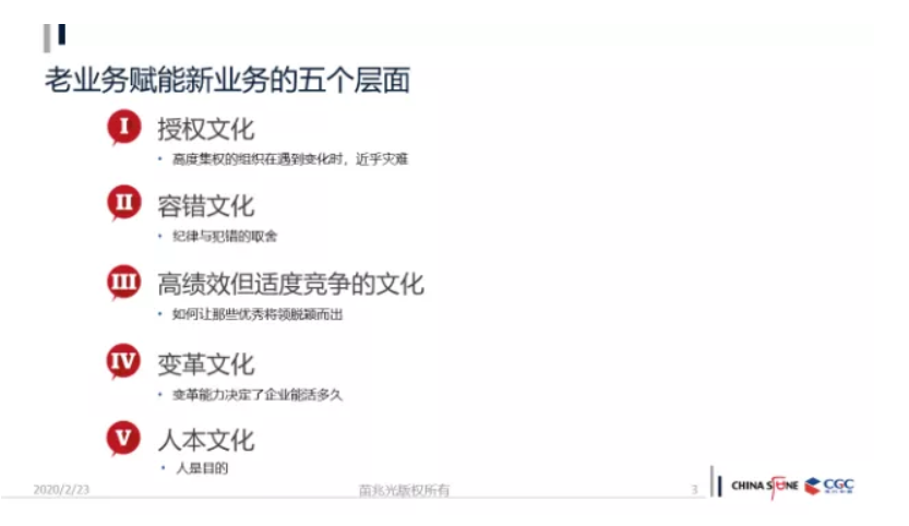 有利于新业务发育的企业文化体现在授权文化、容错文化、高绩效但适度竞争的文化、变革文化、人本文化五个层面,在企业的组织生活场景中,我们逐一去对这五个层面作一番洞察。