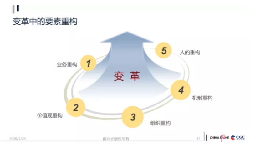 在商业环境多变的时代,企业的人常不能满足未来发展的要求,随着业务的更新、拓宽,人也得重构。以上这几个关键维度的变革重构,里面有很多内容可展开,今天重点不在此,点到为止。