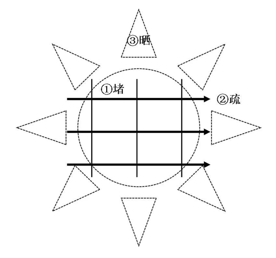 用上图表示,“堵”好像是一堵一堵的墙,“疏”好似是一条一条的渠,“晒”好比是阳光,让隐患提前曝光。
