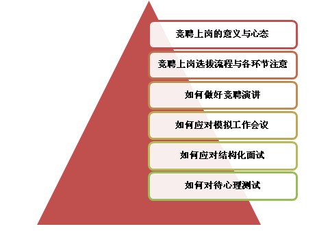 本次“竞聘上岗”辅导,结合企业实际竞聘情况,对课程内容进行有针对性的设置,辅导主要从下以个方向开展: