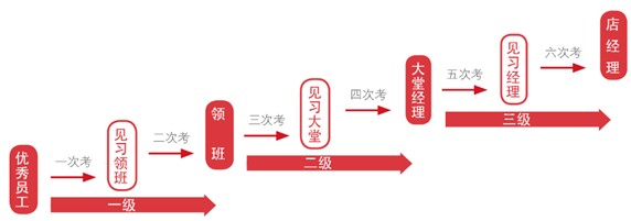 三级六次考,任何一个员工经过如下成长轨迹都有机会成为海底捞的店经理。